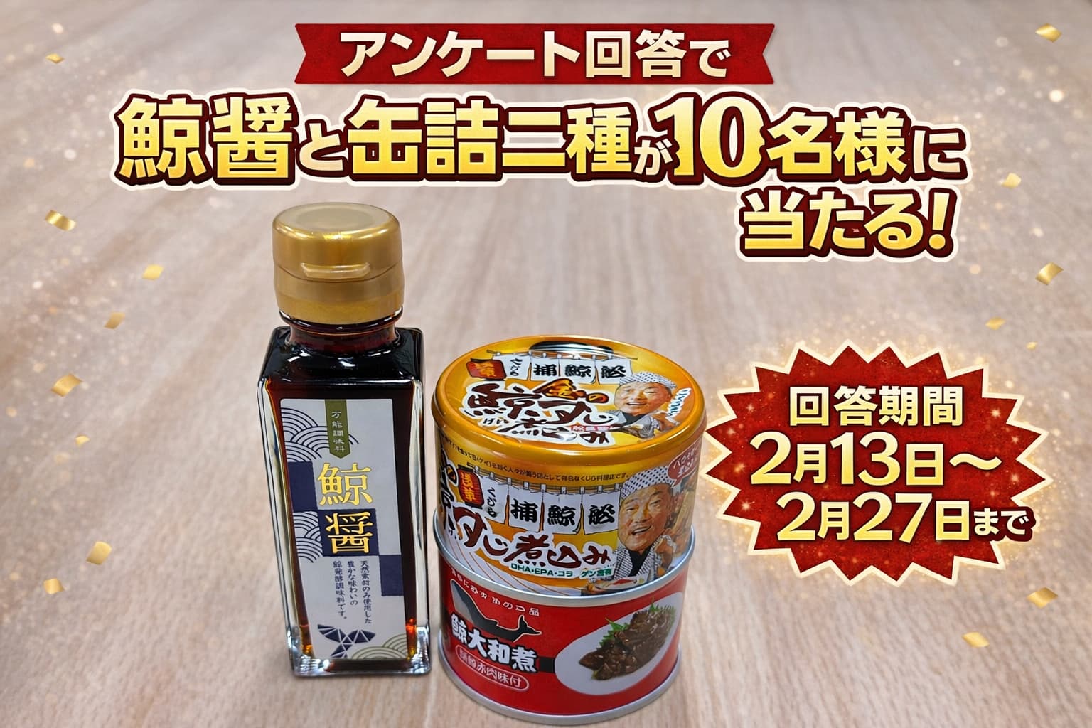 アンケートにご回答いただいた方の中から抽選で10名様に、「鯨醤(発酵調味料)」と「鯨の缶詰二種」をセットにしてプレゼントいたします!