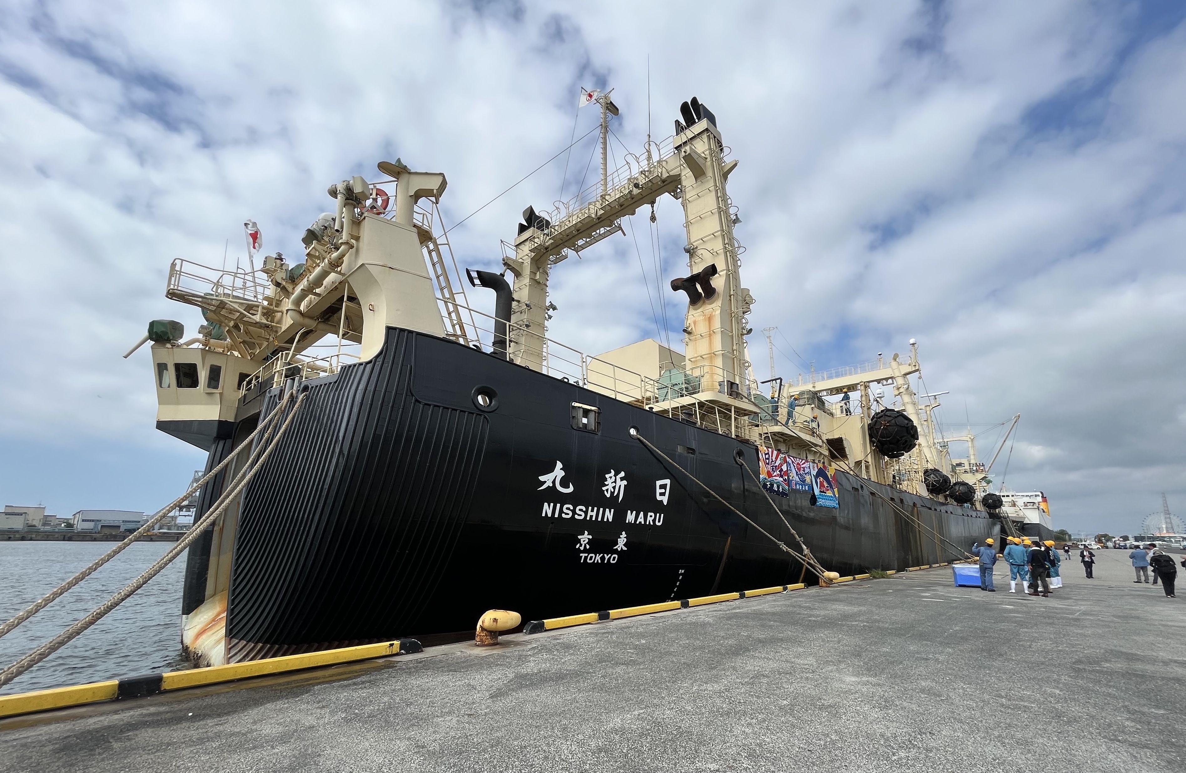 母港は山口県下関市。捕獲したクジラを船内で解体・冷凍・保管・加工まで一貫して処理できる構造を持ち、まさに「海上の捕鯨工場」とも言える存在です。従来の捕鯨母船よりも衛生管理が強化され、船内の解体作業を屋内化したことで、品質維持と効率化の両立を実現しました。
