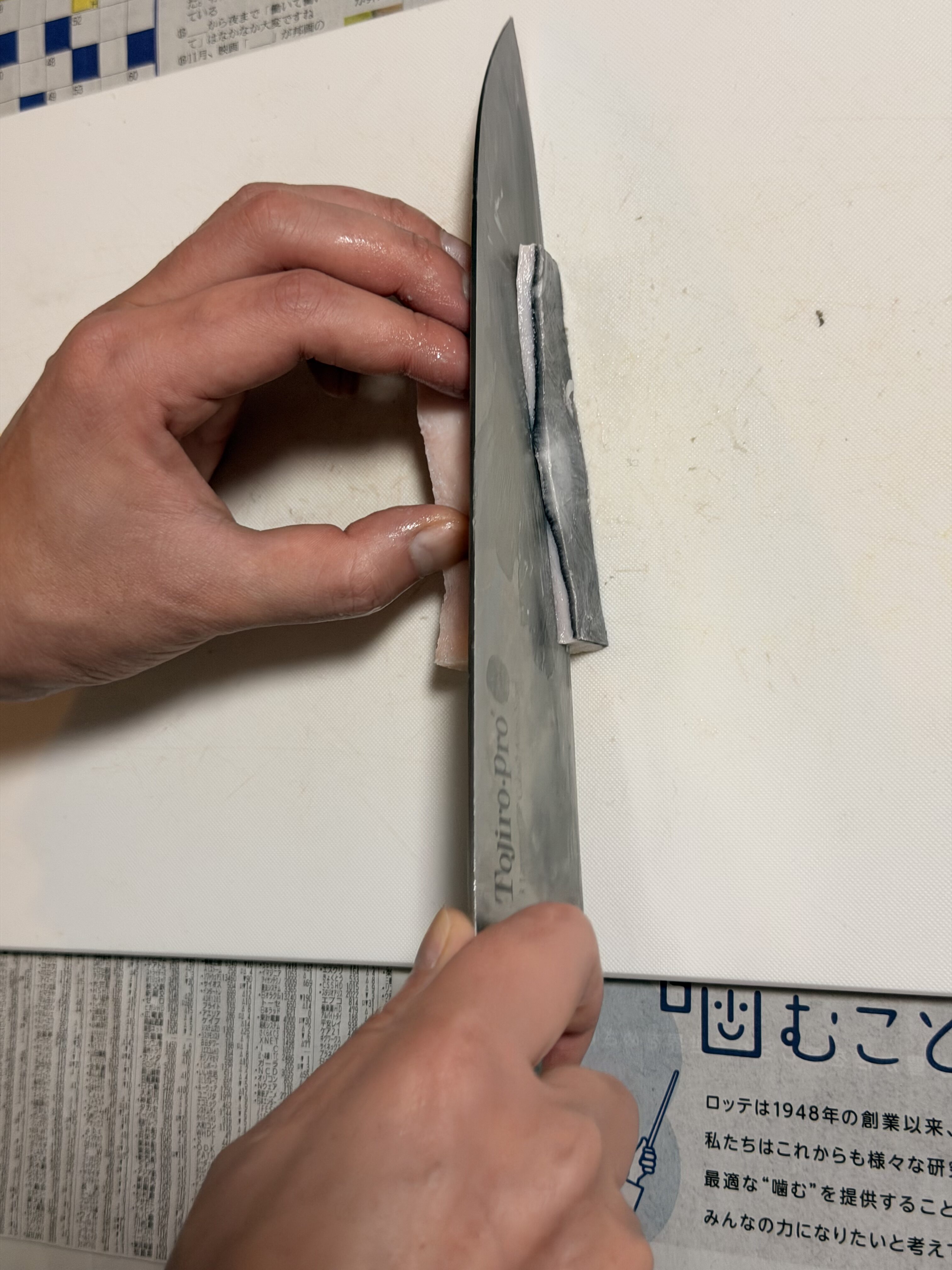 この工程を行うことで、余分な脂が落ちて香りがやわらぎ、本皮特有の食感も引き締まります。全体的に口当たりがよくなり、より食べやすく仕上がるのが特徴です。