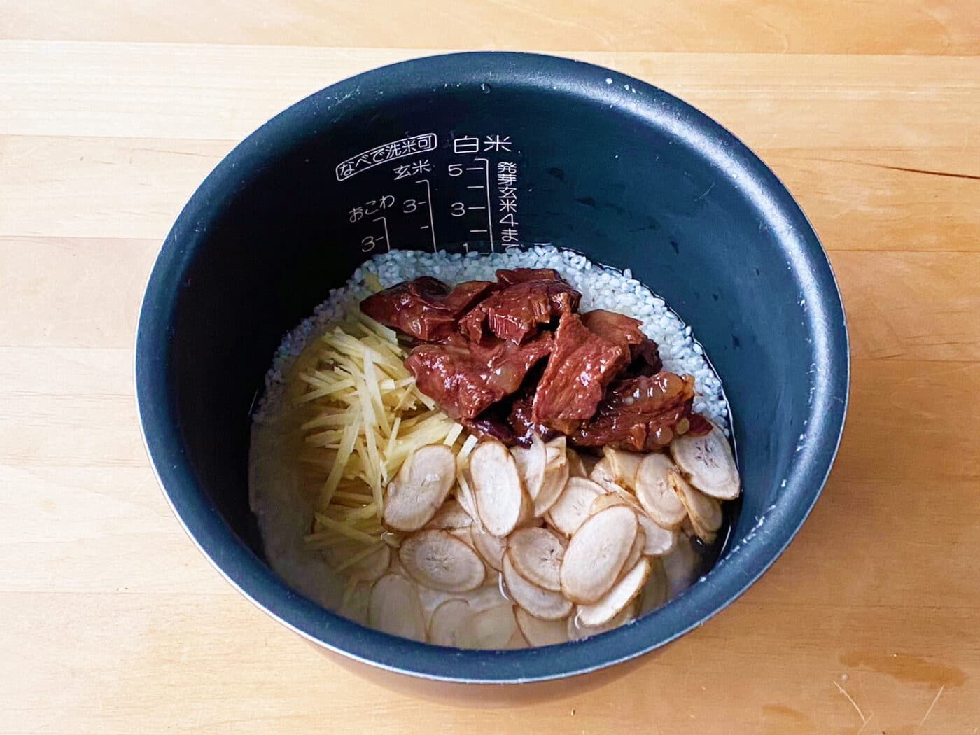 作り方は、とっても簡単。ごぼうやしょうがを刻んだら、くじらの大和煮の缶詰と一緒に、そのまま炊飯器のお釜に詰め込みます。大和煮の缶詰の汁をそのまま使うので、味付けは酒とこんぶだし汁だけでシンプルに。最後に水加減を合わせます。